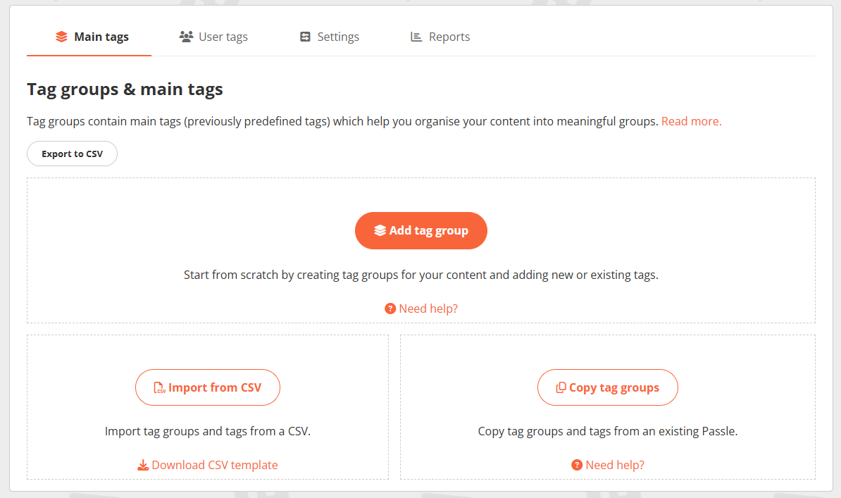 Upload your tag groups and tags in bulk from a CSV file, saving time and keeping your structure clean and organised from the start. - Copy from an existing Passle