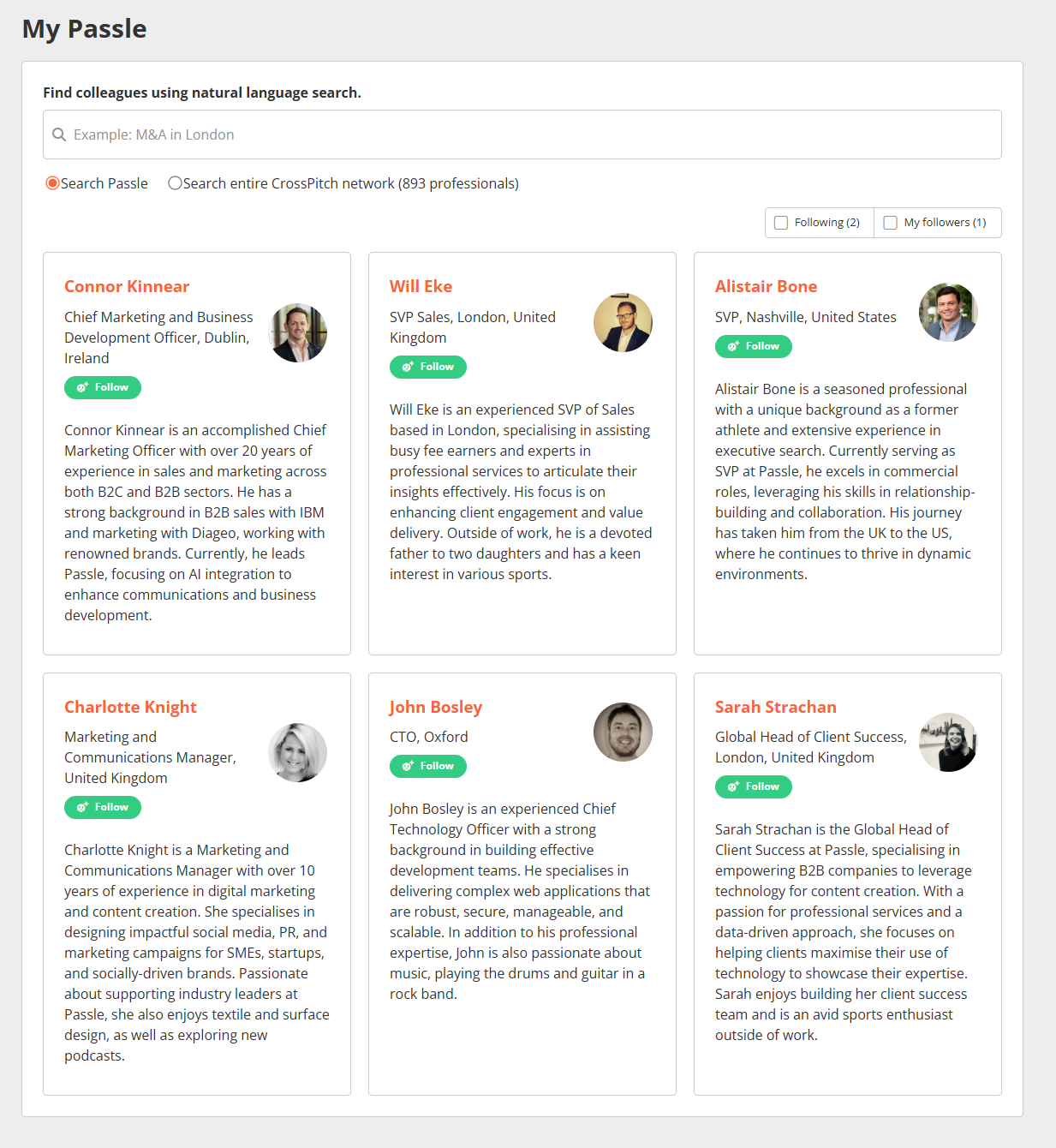 We’ve added a new Follow feature for CrossPitch Search & Send clients. It helps you expand your connections across the firm and stay up to date with posts that support collaboration and grow your network.