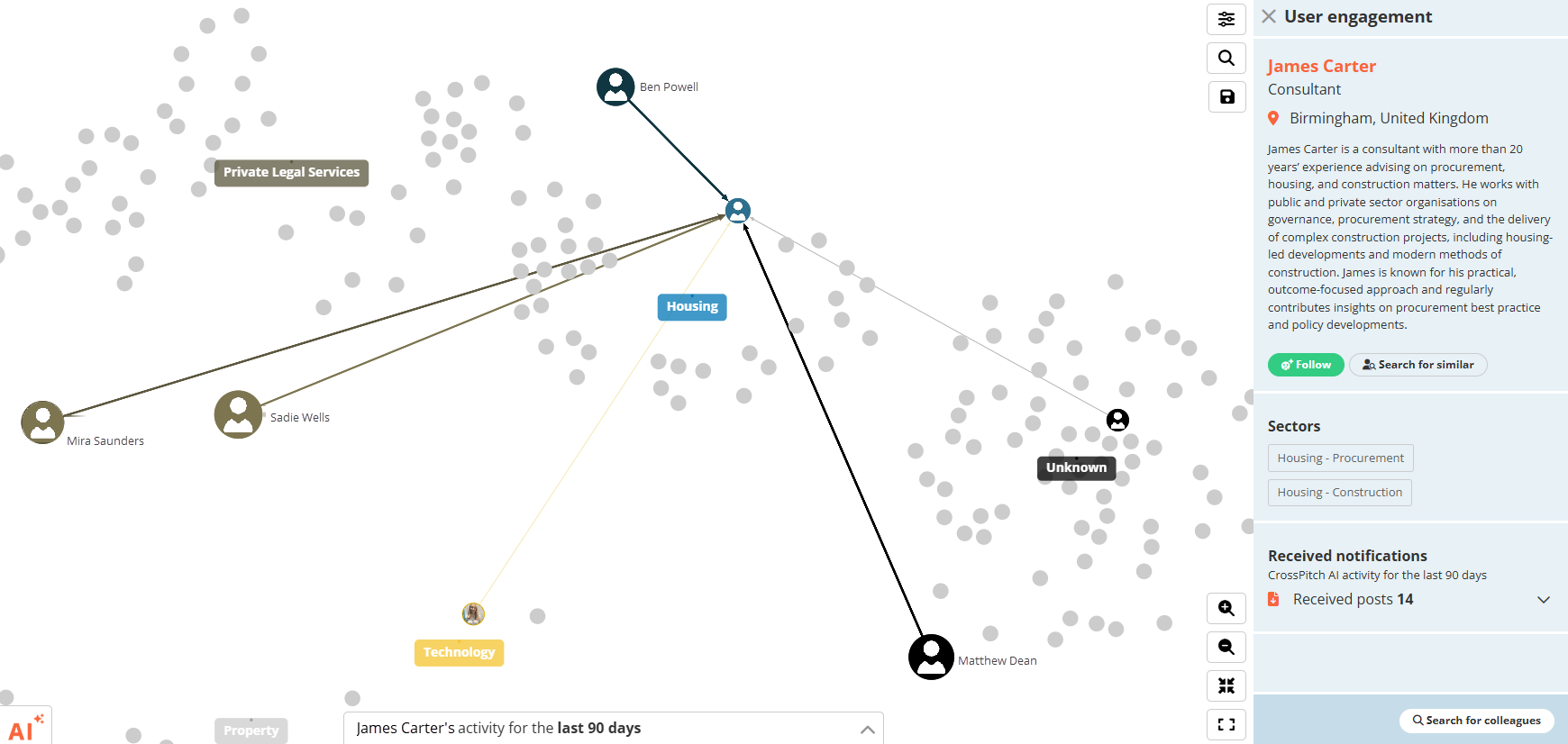 CrossPitch Search is accessible from the map, allowing you to explore profiles and follow colleagues.