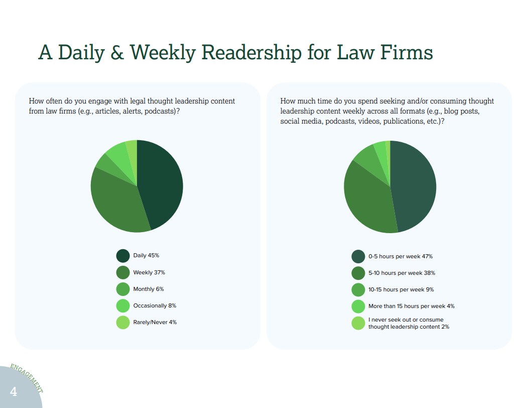 If anything, appetite has grown. Their survey of nearly 200 corporate counsel and C-suite executives found that over 82% access legal thought leadership at least weekly, with 45% engaging daily. Many spend five to ten or more hours per week doing so. This mirrors our data from 2023. These are not passive readers. They are active, hungry, and highly selective.