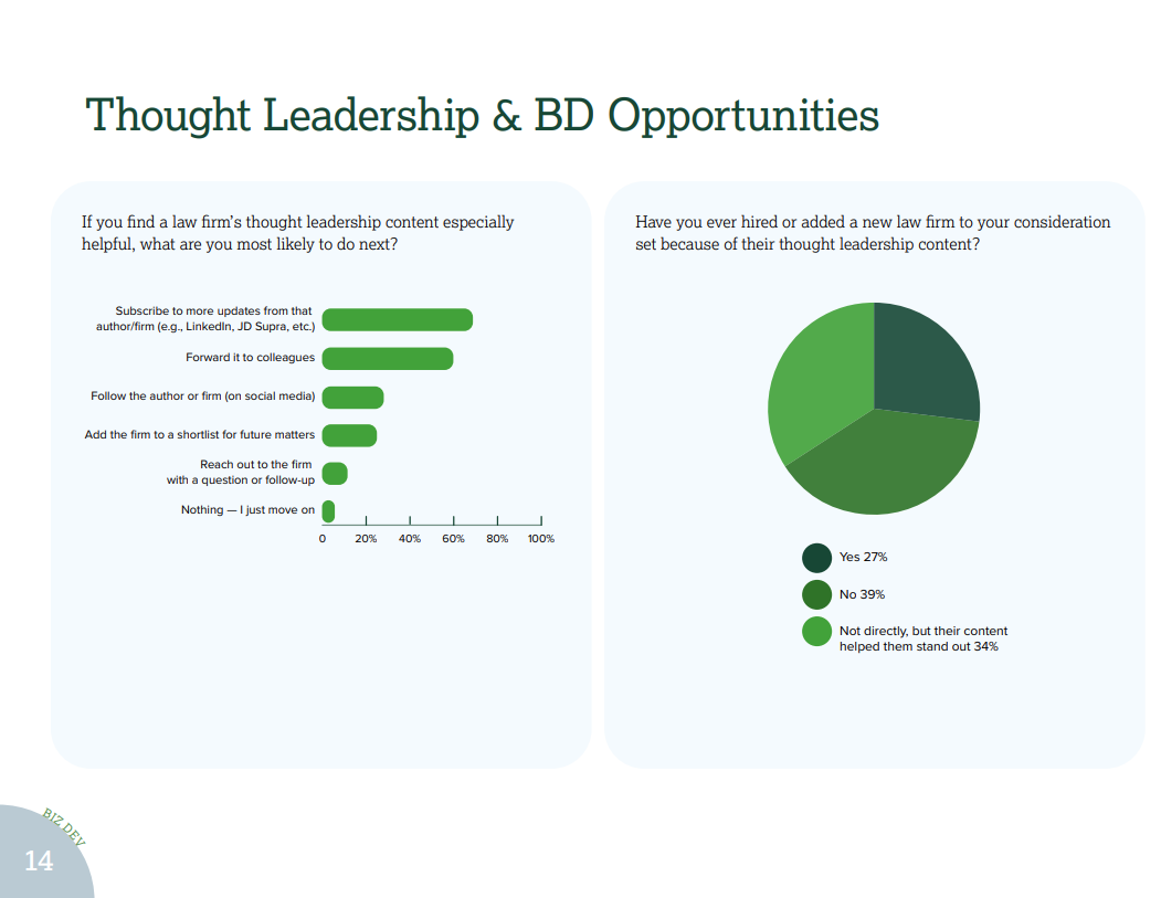 One thing the JD Supra and LIMELIGHT research does brilliantly is close the loop between content and revenue. 61% of respondents said thought leadership had influenced a decision to hire a law firm, with 27% having hired directly on that basis. A further 34% said it helped a firm stand out from competitors.